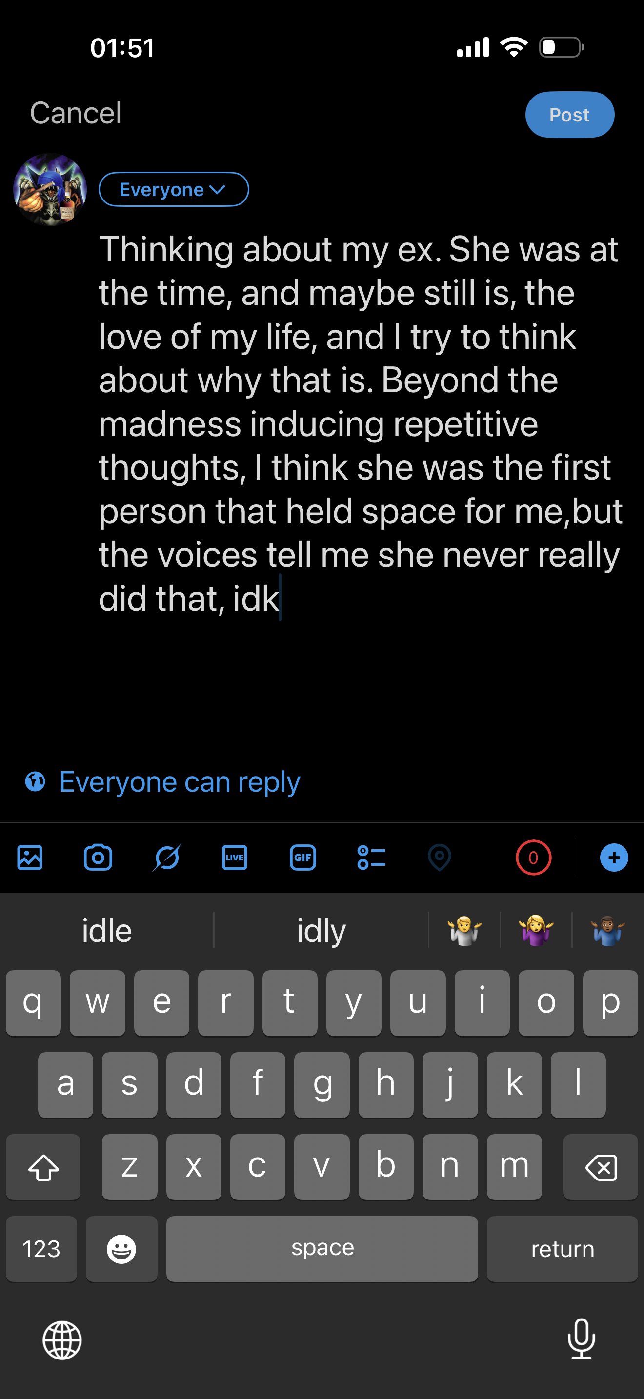 And yeah, the psychosis kind of forced my hand when it comes to admitting how much I love and adore you, but the psychosis also makes it feel like I never knew you at all.